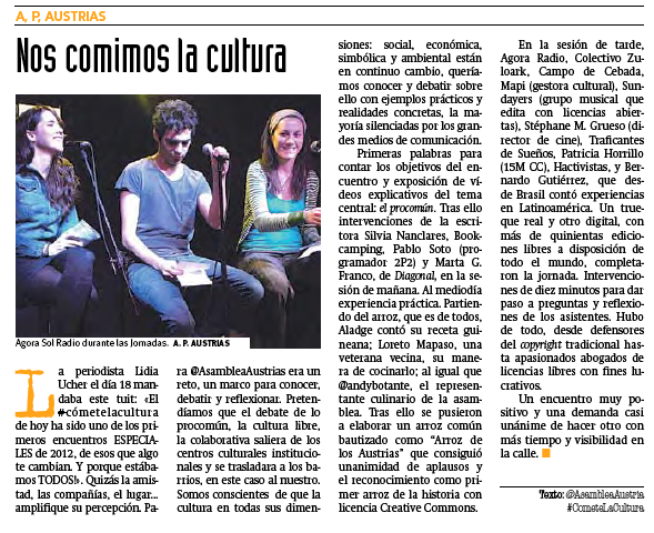 El pasado 18 de abril, Ágora Sol Radio participamos en la jornada «Cómete la cultura», organizada por la Asamblea de los Austrias, en la que participaron también el Colectivo Zuloark, Campo de Cebada, Mapi (gestora cultural), Sundayers, Stéphane Grueso, Traficantes de Sueños, Patricia Horrillo, Hacktivistas y Bernardo Gutiérrez.