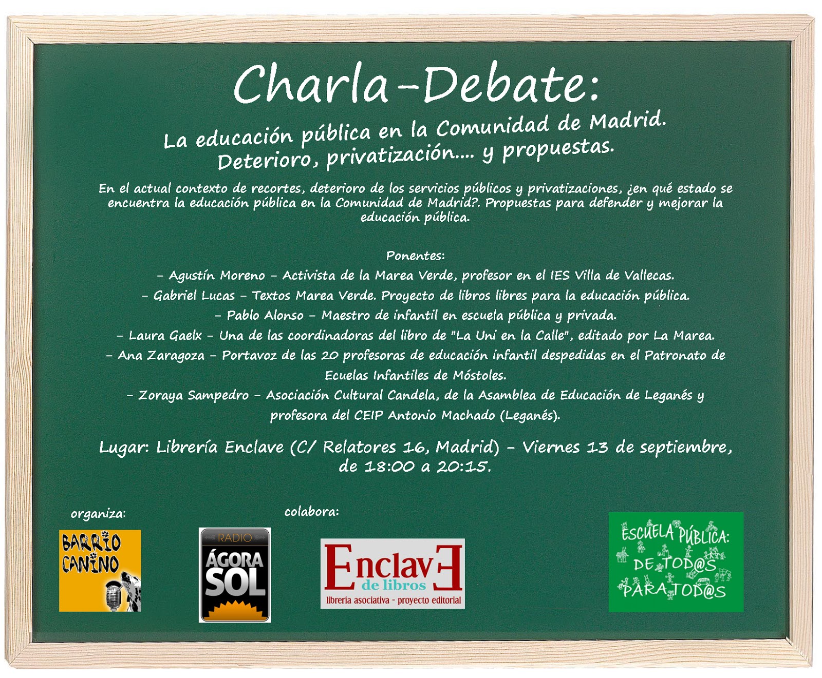 Charla-Debate: La educación pública en la Comunidad de Madrid. Deterioro, privatización…. y propuestas.