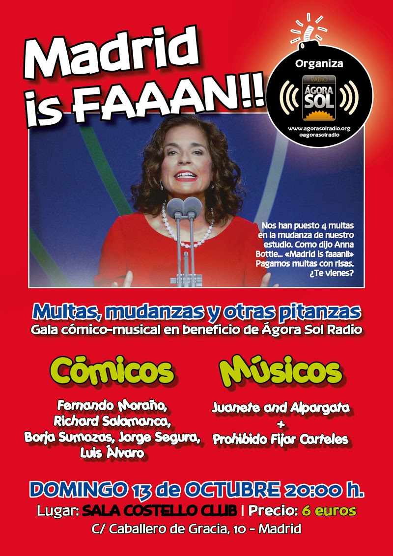 Ágora Sol Radio, emisora libre autogestionada y asamblearia nacida al calor del movimiento 15M en Madrid, organiza este evento en colaboración con los Bipartidos de Risa y el Costello Club.
