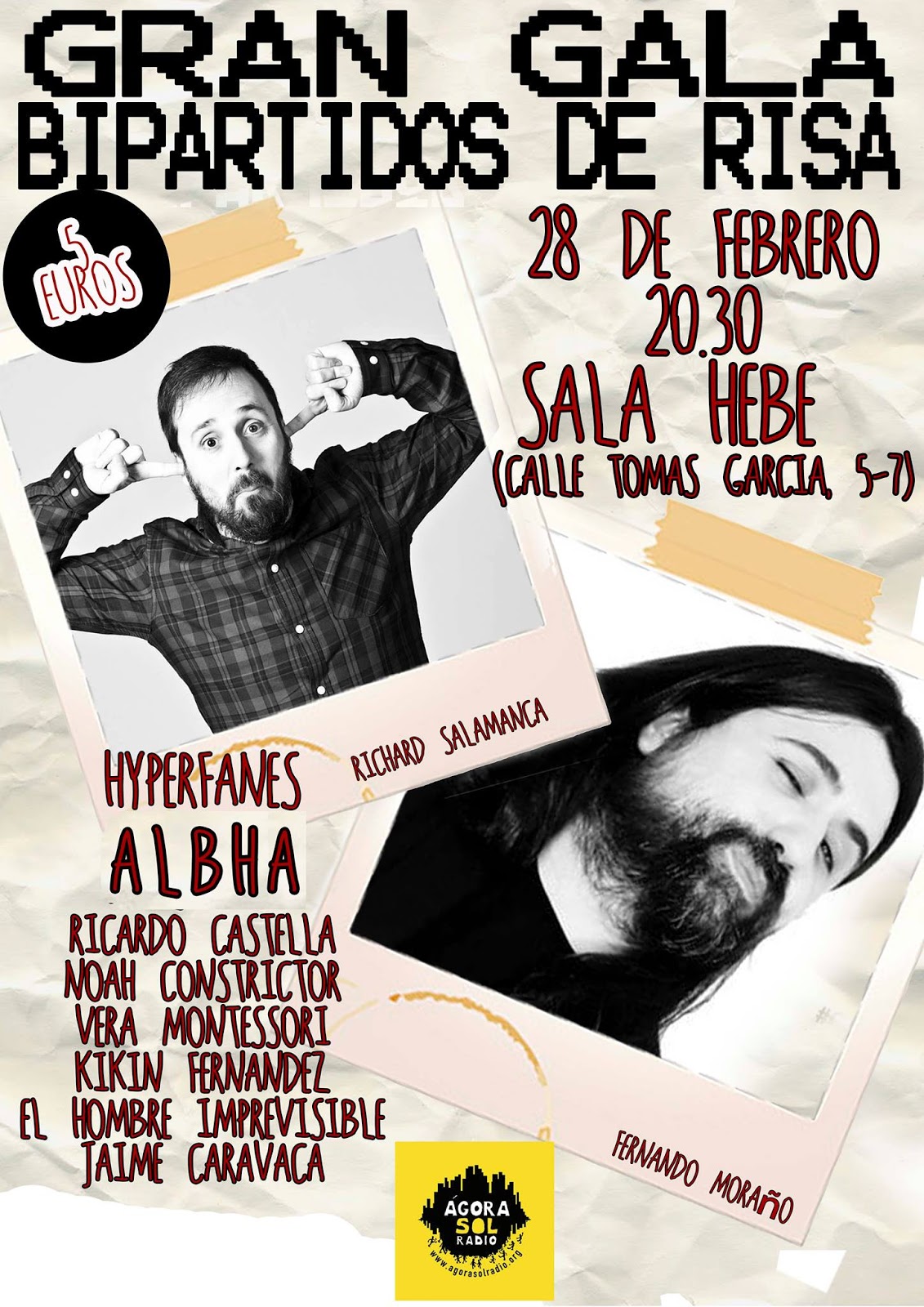 Ágora Sol Radio (@AgorasolRadio), emisora libre, autogestionada y asamblearia, junto con Bipartidos de Risa (@Bipartidos), organizamos la gala cómica «Humor desde abajo» para financiar el equipo y los costes de emisión de la radio.