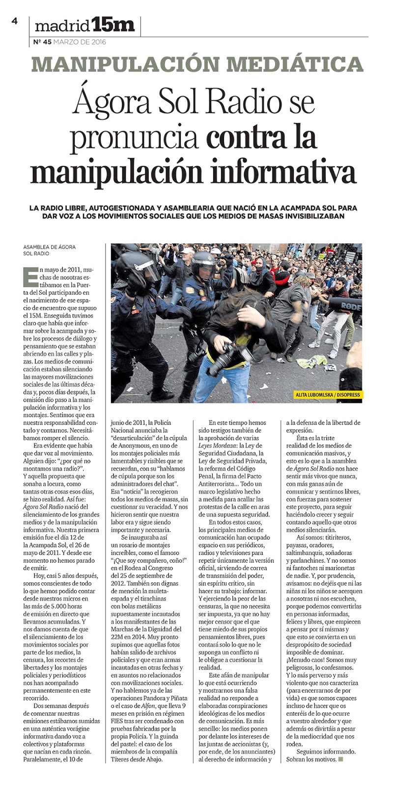 Hoy, casi 5 años después, somos conscientes de todo lo que hemos podido contar desde nuestros micros en las más de 5.000 horas de emisión en directo que llevamos acumuladas. Y nos damos cuenta de que el silenciamiento de los movimientos sociales por parte de los medios, la censura, los recortes de libertades y los montajes policiales y periodísticos nos han acompañado permanentemente en este recorrido.