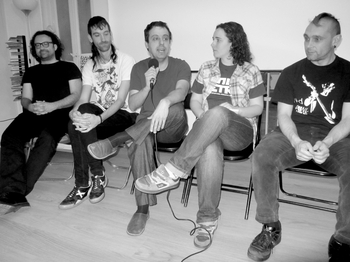 Los ponentes de la charla fueron: Miriam Meda, de Radio Ritmo y coordinadora general de la Red Estatal de Medios Comunitarios (ReMC), Javier García, de Radio Almenara y del grupo de legal de la ReMC, David G. Aristegui, de la Asociación Cultura Libre, Mario, del programa La Casa Incendiada de Radio ELA y Fernando Potencial, de la discográfica independiente Potencial Hardcore.