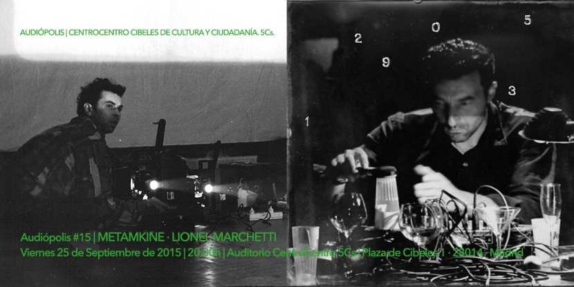 EL COLECTIVO METAMKINE ESTA FORMADO POR CHRISTOPHE AUGER, XAVIER QUEREL A LAS PELÍCULAS Y PROYECTORES DE 16 MM. Y JÉRÔME NOETINGER A LOS DISPOSITIVOS ELECTROACÚSTICOS. MAS INFORMACION EN WWW.METAMKINE.COM. OS RECORDAMOS QUE TANTO LIONEL MARCHETTI COMO EL COLECTIVO METAMKINE ESTARÁN ACTUANDO EL PROXIMO MIERCOLES 23 DE SEPTIEMBRE EN EL ESPACIO SOMN Y EL 25 DE SEPTIEMBRE EN AUDIOPOLIS DENTRO DEL ESPACIO CENTRO CENTRO EN CIBELES 1.
