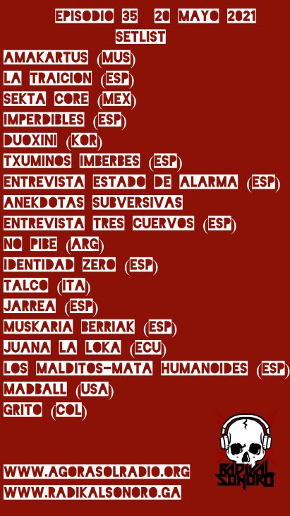 Esta banda que entrevistamos desde Mataró Catalunya lleva formada desde el 2019 como  ESTADO DE ALARMA un nombre que va como anillo en el dedo con toda esta mierda que estamos viviendo. Nos presentan como dicen ellos su primer demo, nosotros diríamos más bien su primer  albúm,  9 temas llenos de punk rock rápido contundente. Este primer trabajo llamado ESTADO DE ALARMA tiene una portada muy chula de nuestro querido rey emérito. «Nos viene al pelo llamarnos Estado de Alarma,  tiene que salir una pandemia para hacer una puta maqueta, estamos esperando bolos queremos subir al escenario, el mejor tema es el que estar por grabar, hemos engañado al colega del estudio de grabación, solo sabemos encender los ampli , yo lo dibujé a lo tonto le puse pintas de okupa, estará en una casa okupa, con los colegas, yo no he dicho nada , por como se había ido y nadie sabia donde estaba, todavía va con números romanos.»,