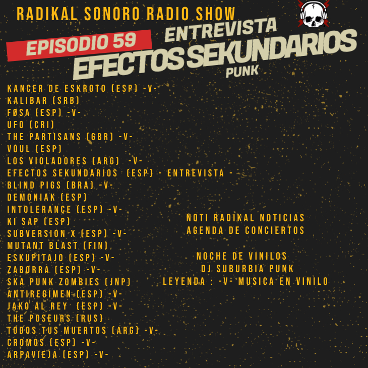 Efectos Sekundarios a pesar de que solo grabaron un disco en 1998 y una demo en1993, han dejado muchos seguidores «Cuando se murio EL VINI (bajista de la banda) ahi también se murió Efectos sekundarios. Nos hemos reunido un par de veces para hacerle un homenaje a nuestro hermano, de momento la banda no está en activo aunque vamos a tocar con los Non Servium en Madrid celebrando los 20 años de NS el próximo año. Nosotros ya tenemos 30 años como banda. Hacíamos conciertos todos los fines de semana con los colegas, era una banda dispuesta a ayudar, solidaria.»