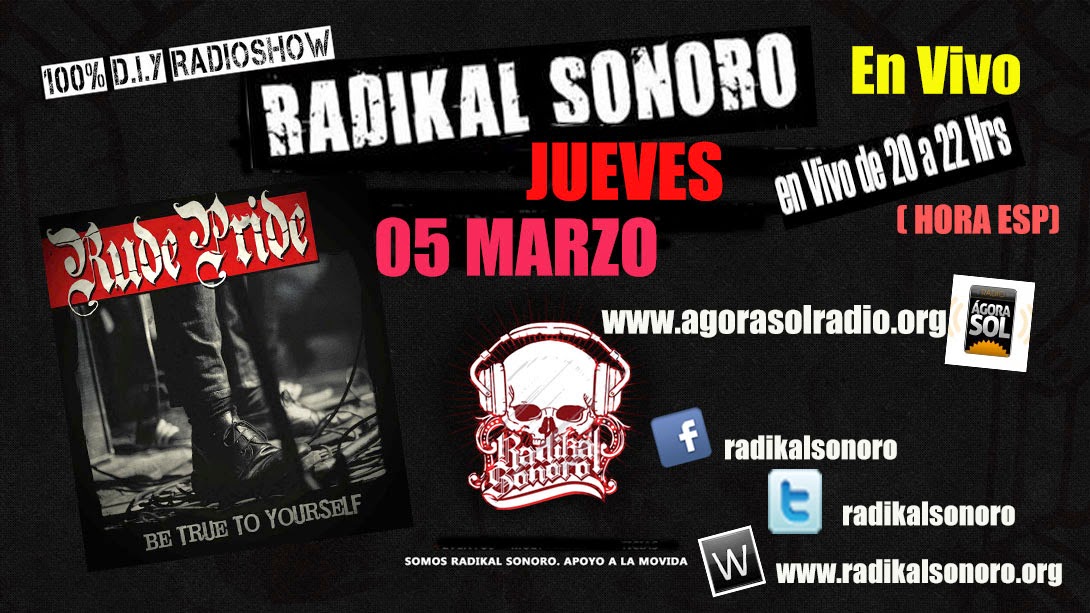 Radikal Sonoro Episodio 32 en Agora Sol Radio , Apoyando la escena Under Latinoamericana y Española (Ska /Punk / Hardcore / Metal / Rock ) Jueves en vivo 20Hrs a 22 Hrs Agora Sol Radio.