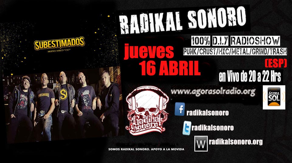 Radikal Sonoro Episodio 36 en Agora Sol Radio , Apoyando la escena  Under Latinoamericana y Española (Ska /Punk / Hardcore / Metal / Rock )  Jueves en vivo 20Hrs a 22 Hrs Agora Sol Radio.