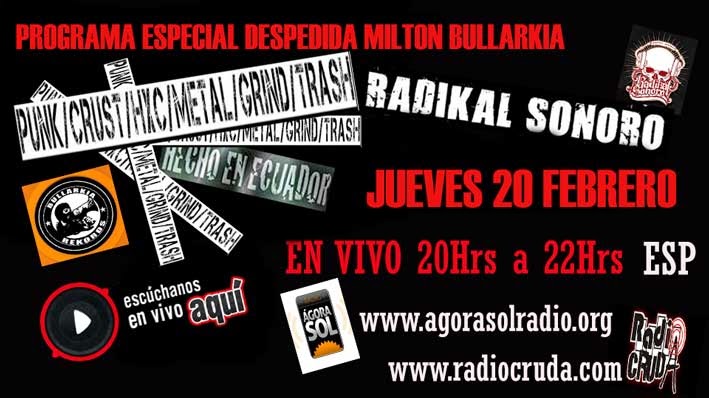 Radikal Sonoro Episodio # 12 Programa semanal de Radikal Sonoro en Agora Sol Radio , En el programa despedimos a nuestro amigo, colaborador y productor de Radikal Sonoro ,Milton Bullarkia que regresa a su pais ,hicimos un programa Especial de la escena Ecuatoriana Hardcore/Metal/Ska/Punk , enfocamos nuestro programa a la escena Punk Ecuatoriana entrevistamos desde Guayaquil a Markos de la banda ZABANDIJAS DE LA 18 y desde Quito Andres Del Sello DECIBELIOS PRODUCCIONES al estudio nos visito jorge cruz encalada (la vieja) de la Vieja Guardia Punk Quiteña.