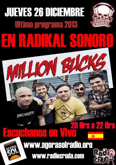 Quinto Programa Radikal Sonoro y último programa del 2013 en Agora Sol Radio , Hoy entrevistamos a la banda Hardcore Madrileña MILLION BUCKS , además hicimos nuestro pequeño especial de musica Anti Navidad . Apoyando la escena Under Latinoamericana y Española , Punk / Hardcore / Metal / Ska / Rock y mucho más. Jueves en Vivo 20Hrs a 22Hrs (Hora España)