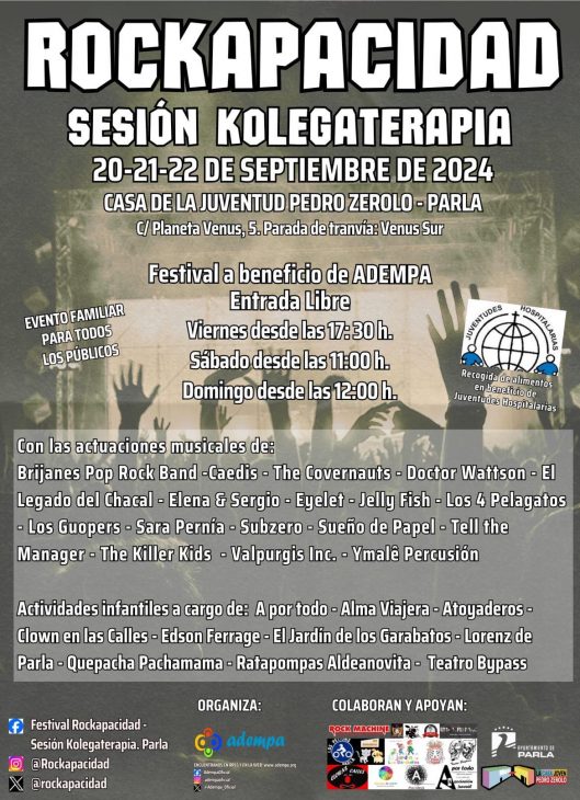 Acá les dejo el programón para que disfrutes a tope ,en donde está incluida una entretenida entrevista con la buena gente de la asociación ADEMPA , muy agradecido a nuestro querido amigo Juan Alberto Martínez Martín (Botas), Marisa Ávila Fernandez y el musicaso Sergio de la banda Cain Brasero que nos vinieron a contar todos los entresijos del festival de Rockapacidad a realizarse en Parla , así que no te lo pierdes , además vuelve nuestro hermano Jesús Caballero (Txus) con su Agenda de Conciertos ,y por supuesto todo esto acompañado con buena música